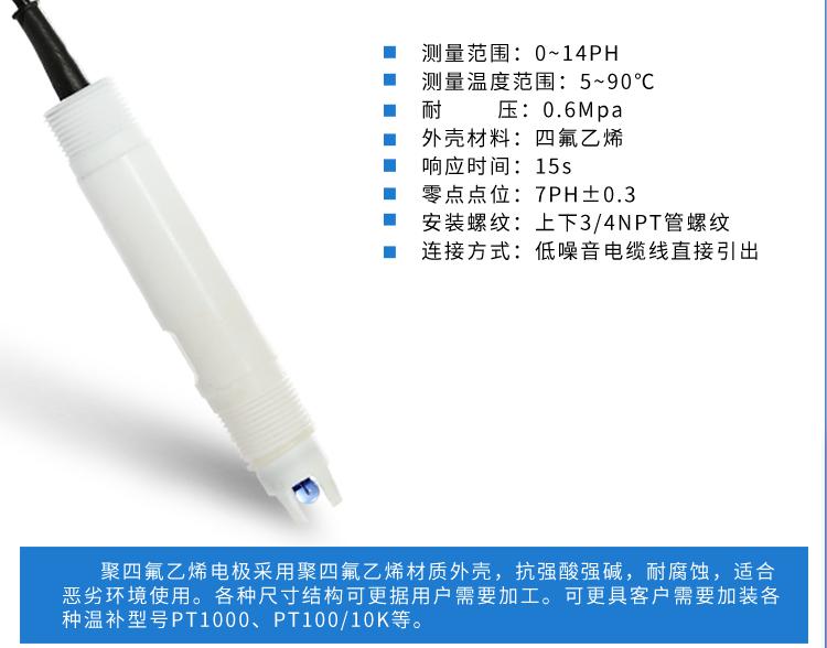聯(lián)測SIN-5013A四氟電極應(yīng)用于紡織印染、工業(yè)廢水、自來水廠、污水處理廠、電鍍廢水等腐蝕性較強(qiáng)的介質(zhì)。
